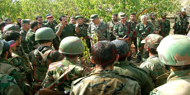 وجدد بواسل الجيش العربي السوري خلال لقائهم المحافظ تأكيدهم على مواصلة حربهم على الإرهاب مهما تطلب ذلك من تضحيات حتى استعادة الأمن والسلام إلى كل ربوع الوطن واعدين بانتصارات قادمة.