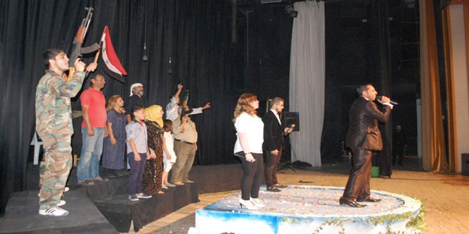 وقال زهير رمضان نقيب الفنانين في تصريح صحفي “إن هذه الأعمال المسرحية التي تقام في مختلف المحافظات ومنها حماة الهدف منها التوجه الى جمهور المحافظة كخطوة أولى ومن ثم التركيز على الأسر المهجرة المقيمة في مراكز الإقامة المؤقتة” مشيراً إلى أن حضوره المسرحية يأتي بهدف الإشراف على عرضها وتقييم مستواها الفني والإبداعي والرسالة التي توجهها تأكيدا على دور الفن كأداة في نشر الوعي تجاه الأوضاع التي تمر بها سورية والتعريف بابعاد المؤامرة الكونية التي تستهدف العيش المشترك بين أبنائها ودورها الحضاري والمس بأمنها وسيادتها ووحدة أرضها وشعبها.