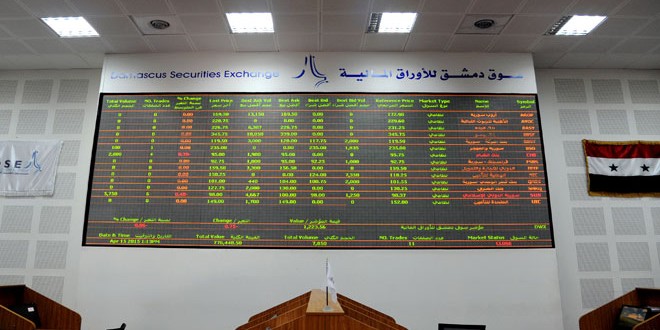 ووفقا لتقرير السوق الأسبوعي الذي حصلت نشرة سانا الاقتصادية على نسخة منه قاد هذا الارتفاع في المؤشر أسعار الأسهم القيادية وجاء في مقدمتها سهم بنك الأردن حيث أغلق على 50ر89 ليرة سورية مرتفعاً بنسبة 99ر4 بالمئة تلاه سهم بنك سورية الدولي الإسلامي مغلقا على سعر 14ر94 ليرة بنسبة 60ر4 بالمئة ثم سهم بنك الشام الذي أغلق على 45ر91 ليرة مسجلاً ارتفاعاً بنسبة 79ر3 بالمئة فيما بلغ حجم التداول نحو50 ألف سهم بقيمة خمسة ملايين ليرة موزعة على56 صفقة دون أي صفقات ضخمة.