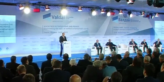 وقال بوتين في كلمته أمام منتدى فالداي الدولي اليوم “إنه بعد قبول دعوة رسمية من قبل الحكومة السورية اتخذنا قرارا لإطلاق عملية عسكرية في سورية وهذه العملية شرعية تماما وهدفها الوحيد هو إعادة السلام إلى هذا البلد” معربا عن قناعته بأن ممارسات العسكريين الروس ستؤثر إيجابيا على الأوضاع في سورية وستساعد على إقامة ظروف للتسوية السياسية فيها.