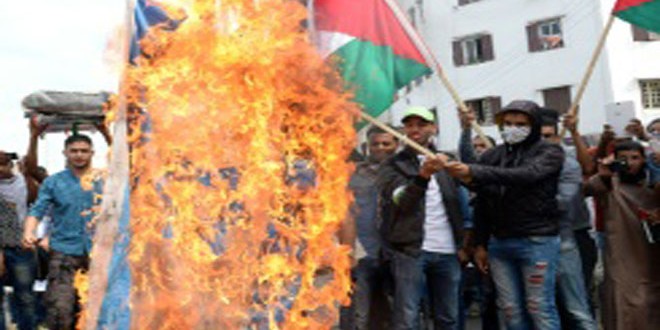 طالب آلاف المتظاهرين المغاربة في مدينة الدار البيضاء اليوم تضامنا مع الشعب الفلسطيني حكومة بلادهم بالإسراع في “تجريم التطبيع” مع كيان الاحتلال الإسرائيلي عبر قانون مع وقف كل أشكال هذا التطبيع.