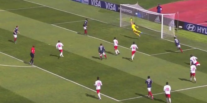 وسجل المنتخب الفرنسي هدفا في أول دقيقة من زمن الشوط الثاني وحاول منتخبنا العودة إلى المباراة لكنه لم يتمكن من الوصول إلى مرمى المنتخب الفرنسي الذي عاد وسجل هدفا رابعا في الدقيقة 66 لتنتهي المباراة بخسارة منتخبنا صفر-4 وليتوقف رصيده عند نقطة واحدة من تعادله سلبا مع نظيره النيوزيلندي في الجولة الثانية لمنافسات المجموعة بعد أن كان استهل مشاركته في البطولة بالخسارة أمام منتخب الباراغواي 1-4.