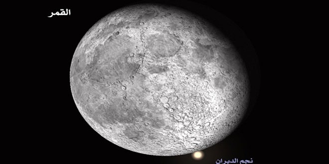 يقترن القمر مع نجم الدبران على مسافة قريبة جدا تبلغ 3ر0 درجة قوسية فقط بعد منتصف ليل الخميس وفجر الجمعة القادمين.