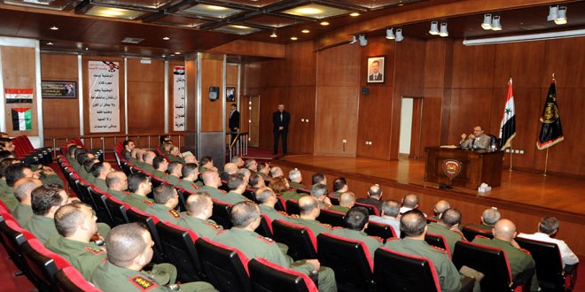 وشدد الوزير الشعار خلال لقائه اليوم الضباط خريجي دورة القيادا ت الوسطى على ضرورة قيامهم بالمهام على أكمل وجه للتصدي للأزمة من خلال التأهيل والتدريب وصولا لدرجة المهارة والتسلح بالإيمان والإرادة في تنفيذ المهام الملقاة عليهم لتحقيق النصر على المتامرين على سورية.