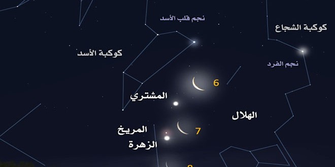 وفي تصريح لسانا قال نائب رئيس الجمعية الفلكية السورية المهندس عبد العزيز سنوبر إنه “في يوم الجمعة المقبل الواقع في السادس من الشهر الجاري يكون الهلال على مسافة 5 درجات قوسية من كوكب المشتري وفي السابع منه يصبح الهلال بين المشتري من جهة والزهرة والمريخ من جهة اخرى بحيث يتوسط المسافة بينها اما في الثامن من تشرين الثاني الجاري يصبح الهلال على بعد نحو 5 درجات قوسية من الزهرة والمريخ”.