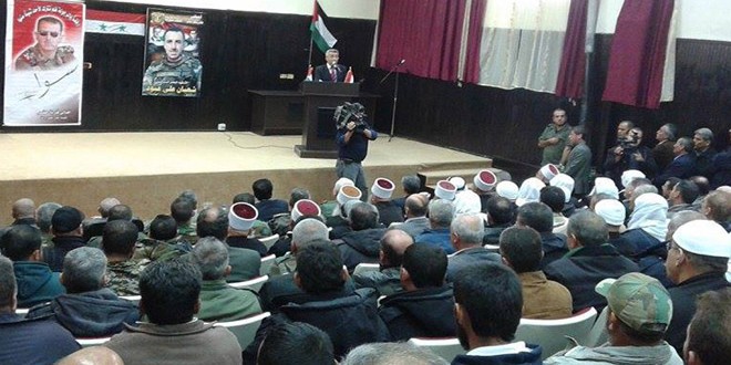 بدوره العقيد حافظ أشار في كلمة له باسم القوات المسلحة إلى أن أوهام الإرهابيين الذين يحاولون تفتيت سورية سقطت وفشلت أمام صمود الشعب السوري وتمسكه بوحدة ترابه الوطني وحفاظه على نسيجه الاجتماعي مؤكدا أن الأيام القادمة تحمل في طياتها الكثير من الانتصارات على التنظيمات التكفيرية الظلامية وتخليص كامل محافظة القنيطرة وبقية المناطق السورية من إرهابها.