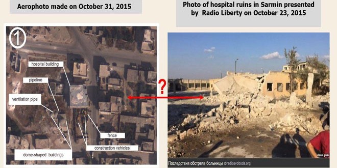 ونشرت وزارة الدفاع الروسية على مواقعها على تويتر وفيسبوك صورا التقطت في 31 تشرين الأول الماضي تبين مبنى المشفى في سرمين والمباني المحيطة به سليمة.