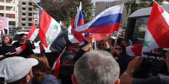 وحمل المشاركون الأعلام الوطنية للبلدين واللافتات التي تعبر عن الشكر والتقدير لروسيا على موقفها الداعم لسورية في حربها على الإرهاب وتهنئ الشعب الروسي في هذا العيد معبرين عن الامتنان العميق لروسيا في دعم الشعوب ومواجهة الارهاب الذي يستهدف سورية وحضارتها وشعبها ومؤسساتها والحفاظ على وحدة أراضيها.