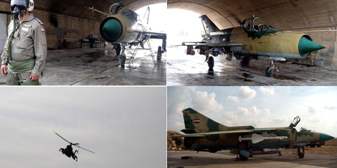 مراسل سانا في البعثة الإعلامية المشتركة وخلال جولة على إحدى قواعد سلاح الجو السوري رصد جانبا من الجاهزية العالية والأعمال والمهام القتالية التي يقوم بها سلاح الجو السوري لدك حصون التنظيمات الارهابية المسلحة حيث أكد أحد نسورنا البواسل الذي مضى على خدمته نحو 27 عاما ويقود طائرة ميغ 21 انه بعد نحو خمس سنوات من الحرب الظالمة على سورية وشعبها لم يتمكن المتآمرون أصحاب الفكر الظلامي الوهابي من تحقيق أهدافهم موضحا أنه يقوم كل يوم بتنفيذ ما بين مهمتين إلى أربع مهمات قتالية جوية ضد التنظيمات الارهابية المسلحة التي تقوم بقتل وتدمير وتهجير السكان لافتا إلى أن هذه التنظيمات تئن من قوة ضربات الطيران الحربي السوري والتي تسهم في ردع عدوانها في الكثير من المواقع القتالية بينما يندحرون ويختبوءون كالجرذان عند سماع هدير طائراتنا المقاتلة ولذلك نراهم يصرخون ويمارسون التضليل الإعلامي من خلال الادعاء بأن الضربات الجوية تستهدف أهدافا غير عسكرية وهذا محض كذب وافتراء.