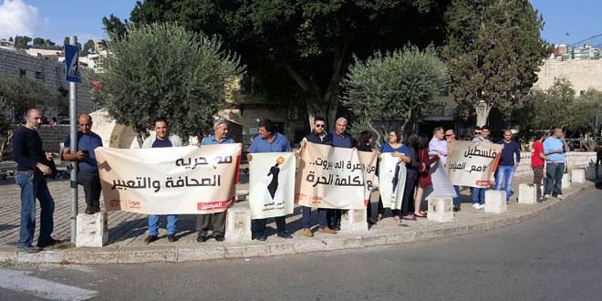 نظم عدد من الإعلاميين الفلسطينيين والناشطين السياسيين اليوم في ساحة العين بمدينة الناصرة شمال فلسطين المحتلة وقفة تضامنية مع قناة الميادين في وجه الضغوط التي تتعرض لها وخاصة قرار إدارة عربسات وقف بثها الفضائي.