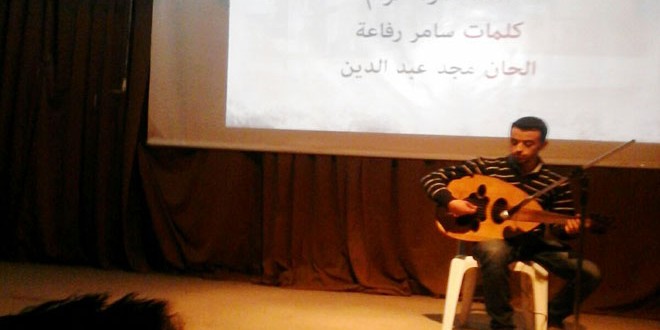 وتضمنت الأمسية معرض صور فوتوغرافية وعزفا على العود وتقديم أغنية بصوت المغنية الشابة سارة عزام إضافة إلى قراءات بالشعر المحكي.