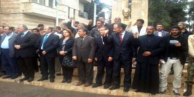 جاء ذلك خلال وقفة تضامنية مساء أمس في ساحة المدينة أعرب المشاركون فيها عن استعدادهم لتقديم الغالي والنفيس لتعزيز صمود الجيش والقوات المسلحة في وجه الإرهاب التكفيري الممول من أعداء سورية الذين يريدون إضعاف دورها المحوري في المنطقة باعتبارها السد المنيع في وجه المخططات الاستعمارية الصهيونية التي ينفذها ويمولها”النفط الخليجي”.