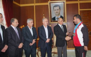 كرمت محافظة حماة البطل الرياضي عهد جغيلي الحائز الميدالية الفضية بلعبة رفع الأثقال والبطل محمد قطيط الحائز الميدالية البرونزية في لعبة كمال الأجسام في بطولة آسيا التي أقيمت في اليابان خلال أيلول الماضي ومحمد رشه مدرب المنتخب الوطني لرفع الأثقال وأحمد الولي رئيس اللجنة التنفيذية للاتحاد الرياضي في حماة ورئيس مكتب العاب القوى عبد الحكيم دهيمش.