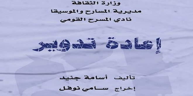 يعرض على خشبة مسرح القباني يوم السبت القادم العمل المسرحي إعادة تدوير وذلك الساعة الخامسة مساء وهي من تأليف وتمثيل أسامة جنيد وسينوغرافيا وإخراج سامي نوفل.