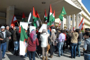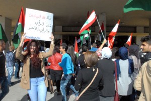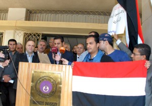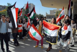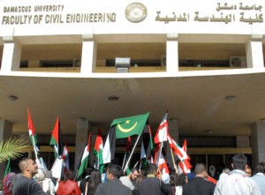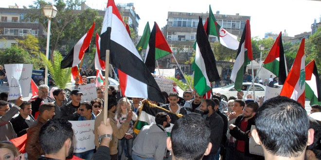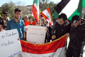 نفذت المنظمات الطلابية العربية في جامعة دمشق اليوم وقفة تضامنية مع قناة الميادين في وجه الضغوط التي تتعرض لها وخاصة قرار إدارة عربسات وقف بثها الفضائي وذلك أمام كلية الهندسة المدنية بدمشق.
