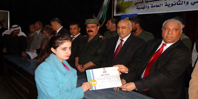 كرمت مديرية التربية وفرع منظمة اتحاد شبيبة الثورة في محافظة الحسكة اليوم 27 من التلاميذ والطلاب المتفوقين بنتيجة امتحانات شهادة الثانوية العامة والمهنية وشهادة التعليم الأساسي لدورة عام 2015 إضافة إلى/5/ من مديري المدارس المتميزة في العام الدراسي الماضي.