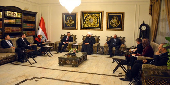 وأشار المفتي حسون إلى عمق العلاقات التي تربط سورية وتشيكيا منوها باستمرار الوجود الدبلوماسي التشيكي في سورية خلال الأزمة في حين غادرها معظم سفراء الدول الأوروبية متمنيا من أعضاء الوفد نقل حقيقة ما يجري في سورية الى الشعب التشيكي والشعوب الأوروبية في مواجهة ما تروجه وسائل الاعلام المغرضة عما يحدث فيها محذرا من “نتائج احتضان بعض الدول الغربية للفكر المتطرف واخرها هجمات باريس التي اذاقت الشعب الفرنسي جزءا من الإرهاب الذي تتعرض له سورية منذ خمس سنوات برعاية أوروبية غربية وخليجية وتركية”.