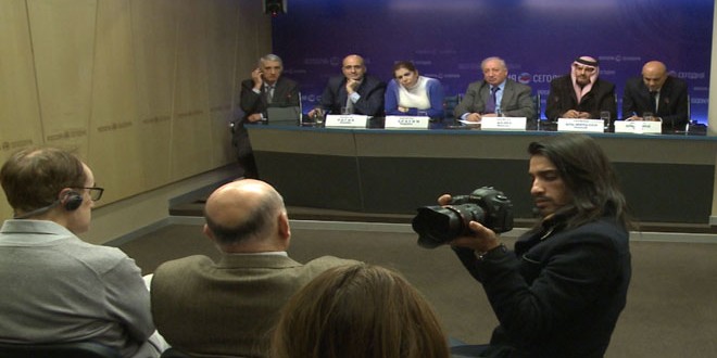 وحول ما يسمى “الجيش الحر” قال ممثلو الوفد “إن ما يسمى “الجيش الحر” انقسم إلى اثنين وعشرين فصيلا ولا يوجد من يمثله على الأرض وأن هناك دولا تريد تسويقه ليكون ممثلا على طاولة المفاوضات” مؤكدين أن من يريد تسويقه هو كيان الاحتلال الإسرائيلي الذي يعالج جرحى التنظيمات الإرهابية ويزودهم بالمعلومات الاستخباراتية وهو على رأس من يدعم ويرعى الإرهابيين.
