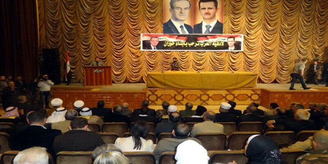 وأوضح الدكتور أحمد حاج علي من أبناء حوران أن سورية تقاتل نيابة عن العالم كله من أجل الإسلام والمسيحية والتضامن وقدمت الشهداء دفاعا عن قضاياها العادلة مؤكدا أن كل سوري هو شهيد أو مشروع شهيد لأن البلاد بمرحلة وطنية تتطلب من الجميع أن يكونوا بمستوى الشهادة والشهداء ليبقى الوطن عصيا على الأعداء.