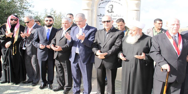 وكان الوفد الشعبي زار في وقت سابق اليوم ضريح الشيخ المجاهد صالح العلي وقرأ الفاتحة على روحه وارواح الشهداء الطاهرة وقدم سيف درع حوران لمتحف الشيخ المجاهد صالح العلي.
