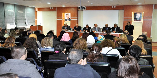 طالب أعضاء فرع نقابة المعلمين بجامعة البعث بالارتقاء بواقع البحث العلمي وتطويره وربطه بسوق العمل ورفع سقف التأمين الصحي وشموليته والتركيز على الدراسات المتعلقة بإعادة الإعمار وتخفيض اجور المواد الراسبة في التعليم المفتوح .