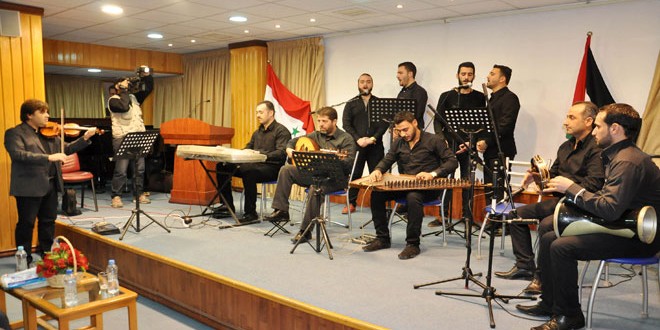 وخلال الأمسية التي أحياها عدد من طلبة كلية التربية الموسيقية بجامعة البعث قدمت مجموعة من الأغاني الوطنية منها سورية يا حبيبتي/ الحق سلاحي وسأقاوم/ أحبائي/ موطني وغيرها.