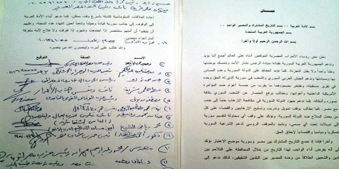 وقعت مجموعة من الشخصيات والأحزاب السياسية المصرية اليوم وثيقة تضامن مع الدولة السورية في حربها ضد الإرهاب وذلك أثناء لقائها رئيس البعثة القنصلية السورية بالقاهرة الدكتور رياض سنيح”.