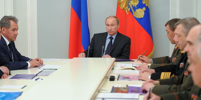 وخلال اجتماعه اليوم مع قادة وزارة الدفاع الروسية في مقر إقامته بضواحي موسكو واستماعه لتقارير مسؤولين عسكريين عبر جسر تلفزيوني أعرب الرئيس الروسي عن شكره لهم على تنفيذ المهمات المطروحة مشددا على أن نتائج هذا العمل “لا تزال غير كافية لتطهير سورية من المسلحين والإرهابيين وحماية روسيا من هجمات إرهابية محتملة” وقال “أمامنا عمل كبير وأنا آمل أن تكون المراحل اللاحقة فى تنفيذ المهمات على المستوى نفسه من الجودة والمهنية وتؤتي ثمارها”.
