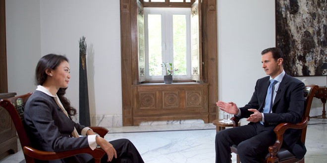 وأشار الرئيس الأسد في مقابلة مع محطة فينيكس الصينية إلى أنه لا جدول زمنيا للقضاء على الإرهاب لأن الأمر لا يتعلق فقط بالتقدم على الأرض بل بالدعم الذي يتلقاه الإرهابيون من بلدان أخرى لأن العديد من الدول في الغرب وفي المنطقة لا مصلحة لها في التوصل إلى حل سياسي وهم يؤمنون فقط بدعم الإرهابيين من أجل إسقاط الدولة السورية لذلك فإنهم يريدون إطالة أمد الأزمة ولا يملكون إرادة محاربة الإرهاب.