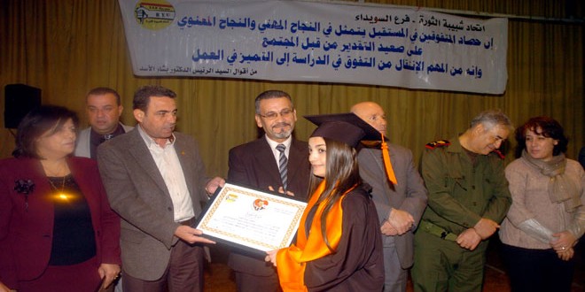 كرم فرع منظمة اتحاد شبيبة الثورة في السويداء بالتعاون مع مديرية التربية اليوم 32 طالبا وطالبة من المتفوقين في شهادتي التعليم الأساسي والثانوي على مستوى المحافظة إضافة إلى عدد من مديري المدارس المتميزين.