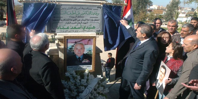 تخليدا لذكرى الشهداء وتقديرا لتضحياتهم في سبيل الدفاع عن الوطن وبمناسبة اعياد تشرين ازيح الستار اليوم عن اللوحة التذكارية لحديقة الشهيد العميد الطيار هنيدي اسعد عماد في مدينة السويداء بحضور فعاليات رسمية وحزبية.