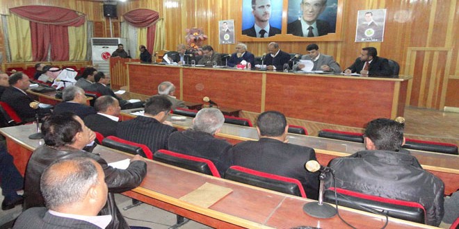 وقدم مدير الزراعة عامر سلو عرضا عن الواقع الزراعي وما تم تنفيذه من الخطة الزراعية الحالية مبينا أن المساحات المزروعة حتى الآن من القمح البعل بلغت 64 ألف هكتار والمروي 46 ألف هكتار والشعير البعل 65 ألف هكتار والمروي 7200 هكتار والبقوليات الغذائية 3100 هكتار.