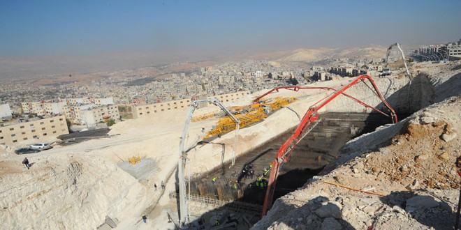 وأوضح الصموعة أن مدة العقد 3 سنوات على الهيكل وتعمل المؤسسة على إنهاء المشروع بسنتين حيث يتواصل العمل في المشروع ليلا نهارا بكوادر وطنية مشيرا إلى أن الحفريات كانت “قاسية جدا” وتم تنفيذ 250 ألف متر مربع خلال شهرين بمعايير هندسية عالية الجودة من ناحية العزل وأن الأعمال الإنشائية مدروسة إنشائيا ضد الزلازل والرياح.