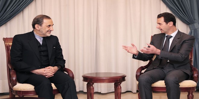 وأكد الدكتور ولايتي للرئيس الأسد تصميم قائد الثورة الإسلامية والقيادة الإيرانية على المضي قدما في دعم الجمهورية العربية السورية حكومة وشعبا لأن الحرب التي يخوضها السوريون ضد الإرهاب مصيرية للمنطقة والعالم.