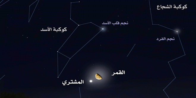 وفي تصريح ل سانا قال نائب رئيس الجمعية الفلكية السورية المهندس عبد العزيز سنوبر ان الاقتران يشاهد في كوكبة الأسد من بعد الساعة الواحدة صباحاً وحتى طلوع الشمس فوق الأفق الشرقي.