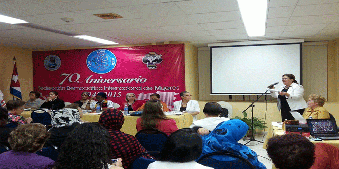 وتقدمت خضور بالشكر من الاتحاد النسائي الديمقراطي العالمي ورئيسته /مارسيا كامبوس/ لوقوفهم وتضامنهم مع الشعب والمرأة السورية من خلال الوقفات التضامنية واصدار بيانات تدين الارهاب في سورية معربة عن سعادتها بانعقاد اجتماعات الاتحاد في كوبا التي تربطها مع سورية علاقات استراتيجية تمتد لعقود وتتعزز في ظل قيادتي البلدين.