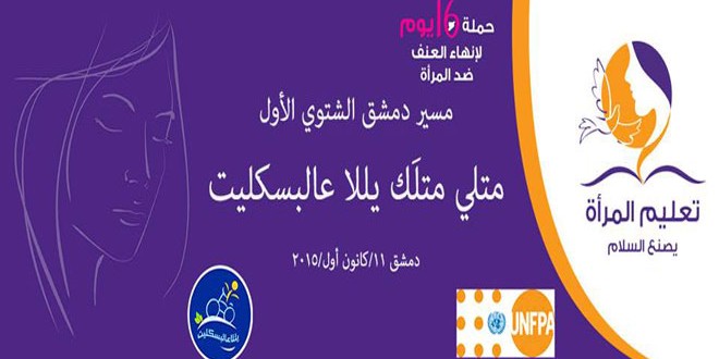 تنظم مبادرة “يلا عالبسكليت” ضمن برنامج فعاليات حملة” 16 يوم” لإنهاء العنف ضد المرأة التي يقيمها”صندوق الأمم المتحدة لسكان” “مسير دمشق الشتوي الأول” للدراجات الهوائية تحت عنوان ” متلي متلك يلا عالبسكليت” وذلك في الثامنة من صباح يوم الجمعة القادم بمشاركة واسعة من مختلف الفئات العمرية والشرائح الاجتماعية حيث سيقوم المشاركون في المسير بجولة على الدراجات الهوائية على اتوستراد المزة وبعض الطرق الفرعية.