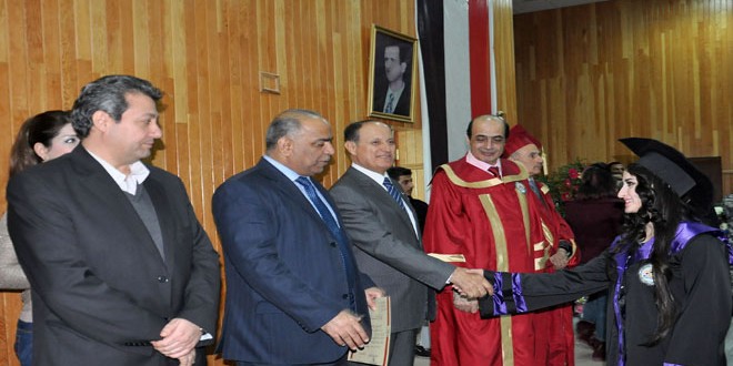 وأشارت الطالبة نبيلة ابراهيم من قسم الغزل في كلمة الخريج الأول إلى أن “هذا التكريم عزز إيماننا وإصرارنا على العلم وحرصنا على التمسك بمبادئنا فمنبر العلم أمانة في أعناق الطلبة ومن واجبنا أن نحفظ ونصون هذه الأمانة فبالعلم تحيا روح الإنسان ويتجدد شبابه في هذه الحياة” مشيدة بالدور الكبير الذي لعبته جامعة البعث بكل كوادرها التدريسية والتعليمية لتوفير ما يحتاجه الطلبة.