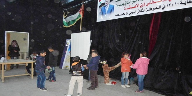 بمناسبة اليوم العالمي للمعوقين أقامت مديرية الشؤون الاجتماعية بالحسكة بالتعاون مع مديريتي الثقافة والتربية اليوم حفلا فنيا منوعا قدمه طلاب معهد الصم والبكم وذلك في صالة المركز الثقافي بالمدينة.