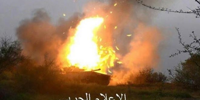 تمكن الجيش اليمني واللجان الشعبية اليوم من تدمير دبابة إبرامز تابعة لنظام آل سعود أمريكية الصنع في موقع كروس المعزاب في منطقة جيزان جنوب السعودية.