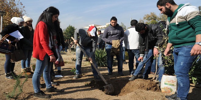 نفذ فرع جامعة دمشق للاتحاد الوطني لطلبة سورية اليوم حملة تشجير وعملا تطوعيا تضمن تنظيف الحدائق في كلية الزراعة بدمشق ضمن فعاليات المهرجان الشبابي الذي ينظمه الفرع.