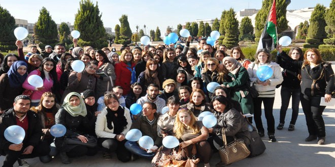 نفذ طلبة كلية التربية في جامعة البعث بحمص اليوم فعالية شبابية تعبيرا عن تضامنهم ودعمهم لحقوق الطفل بالتعلم وذلك ضمن حملة /الجناح الأزرق/ التابعة للمركز السوري لحقوق الطفل.