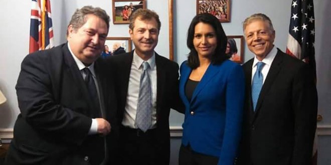 وعبر الوفد عن تأييد المنتدى لمشروع القانون الذي قدمته غابارد إلى الكونغرس بعنوان “منع استخدام أي أموال لتقديم المساعدات للمجموعات والأفراد السوريين المعارضين”.