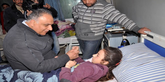زار محافظ حمص طلال البرازي مساء اليوم الجرحى والمصابين ضحايا التفجير الإرهابي الذي استهدف حي الزهراء بحمص اليوم وأدى إلى استشهاد 18 مواطنا وإصابة 29 آخرين وذلك في مشفيي الزعيم الطبي الجراحي والرازي واطمأن على أوضاعهم وتفقد أحوالهم وأسرهم.