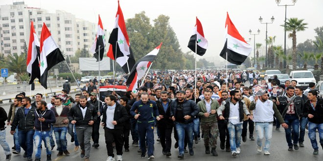 وعبرت الطالبة “مرح عماد” إحدى المشاركات في المسير عن ثقتها بقدرة الجيش والقوات المسلحة على تطهير أرض الوطن من رجس الإرهابيين وتحقيق النصر المؤزر على الأعداء وأدواتهم الإرهابية مؤكدة وقوف طلبة سورية إلى جانب رجال الجيش في خندق واحد ليكتبوا بصمودهم وبطولاتهم وتضحياتهم مستقبل سورية المشرق.