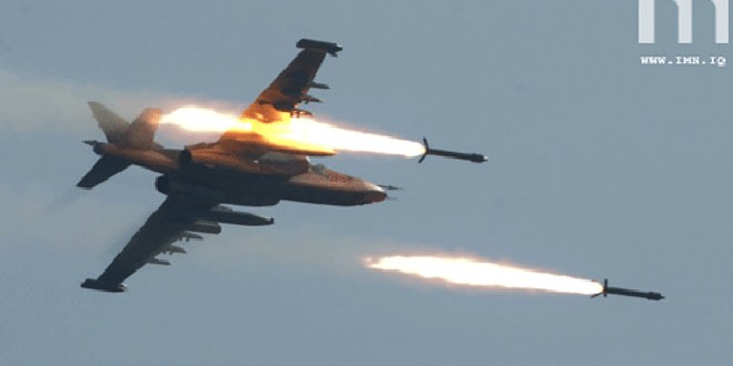 وقال القيادي في الحشد الشعبي العشائري في محافظة الأنبار مروان المحمدي لمراسلة سانا في بغداد ان “طيران الجيش العراقي قصف مركزا لتجمع تنظيم داعش الإرهابي في حي الروسين في مدينة الرمادي ما أسفر عن تدمير المركز ومقتل عشرة إرهابيين بينهم متزعمون وتدمير 9 سيارات ومنصة لإطلاق الصواريخ”.