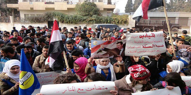 وتم خلال الوقفة التضامنية تلاوة بيان لشبيبة الحسكة جاء فيه أن .. “كوادر فرع اتحاد شبيبة الثورة بالحسكة تدين وتستنكر بأشد العبارات القرارات الصادرة من المعنيين عن إدارة قمر عربسات القاضية بإيقاف البث الفضائي لكل من قناتي المنار والميادين ومن يقف وراءها لكون هذا القرار لا يخدم سوى أهداف الكيان الصهيوني وآماله وتطلعاته اليائسة في ضرب خط الممانعة والمقاومة في المنطقة” .