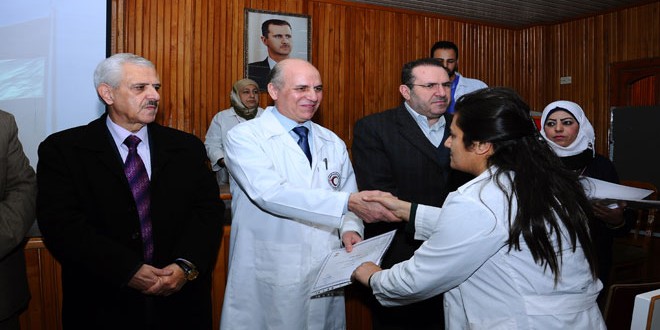 حضر التكريم رئيس مكتب النقابات المهنية بفرع دمشق لحزب البعث العربي الاشتراكي زياد بسمة ومدير صحة دمشق الدكتور هيثم الحسيني.