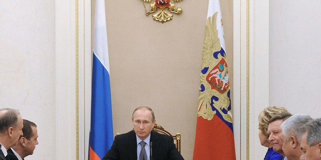 بحث الرئيس الروسي فلاديمير بوتين اليوم مع الأعضاء الدائمين في مجلس الأمن الروسي مسائل قطع التمويل عن الإرهاب وآفاق تسوية الأزمة في سورية والوضع الاقتصادي في روسيا.