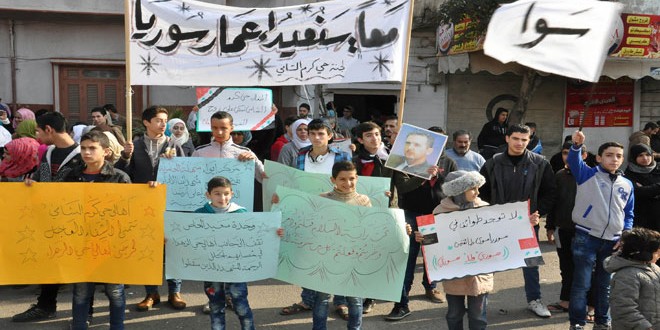 وأعرب مختار حي كرم الشامي احسان البابا عن ثقته بفشل كل محاولات التنظيمات الإرهابية النيل من صمود سورية فيما أشار رئيس لجنة الحي فيصل الابرش إلى بشاعة وشناعة العمل الإجرامي الذي استهدف حي الزهراء مبينا أن الهدف من الوقفة اليوم هو التأكيد أن سورية موحدة في مواجهة الإرهاب.